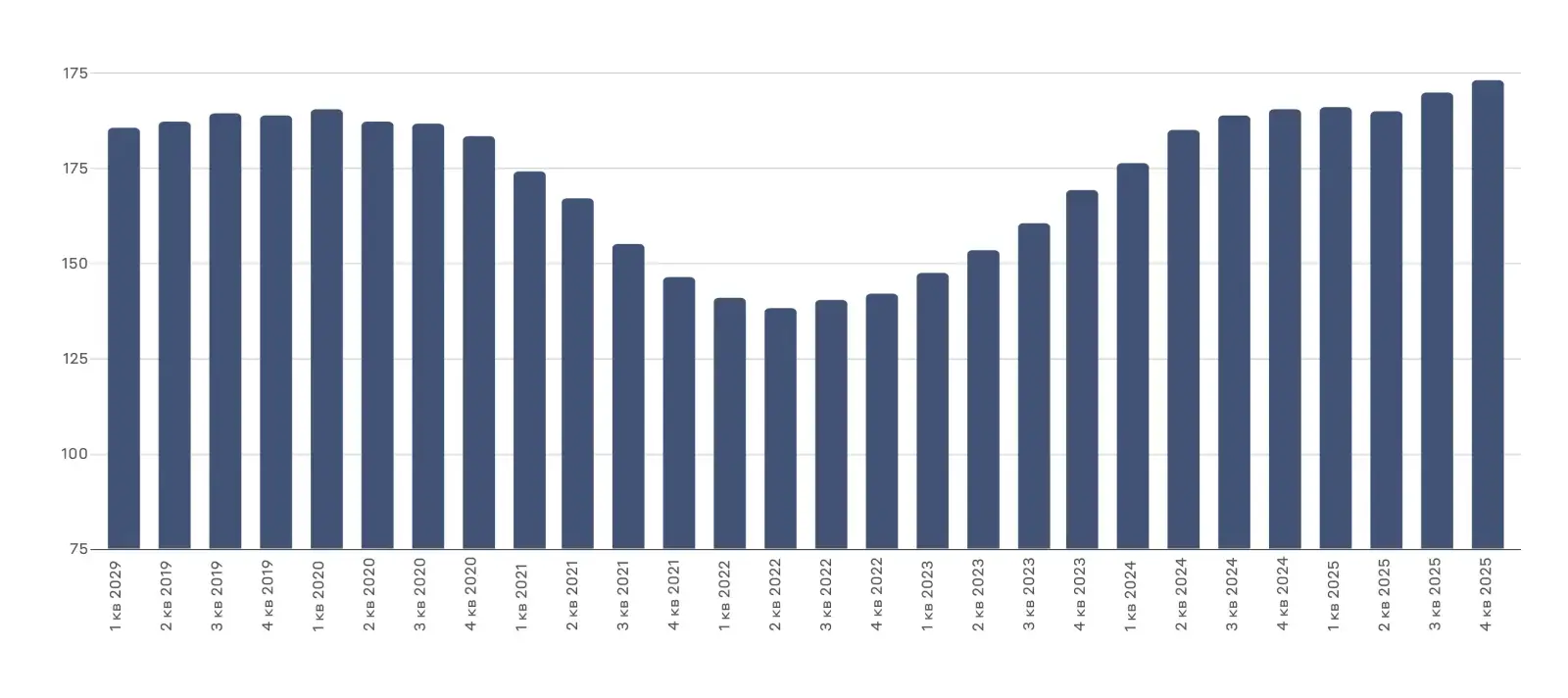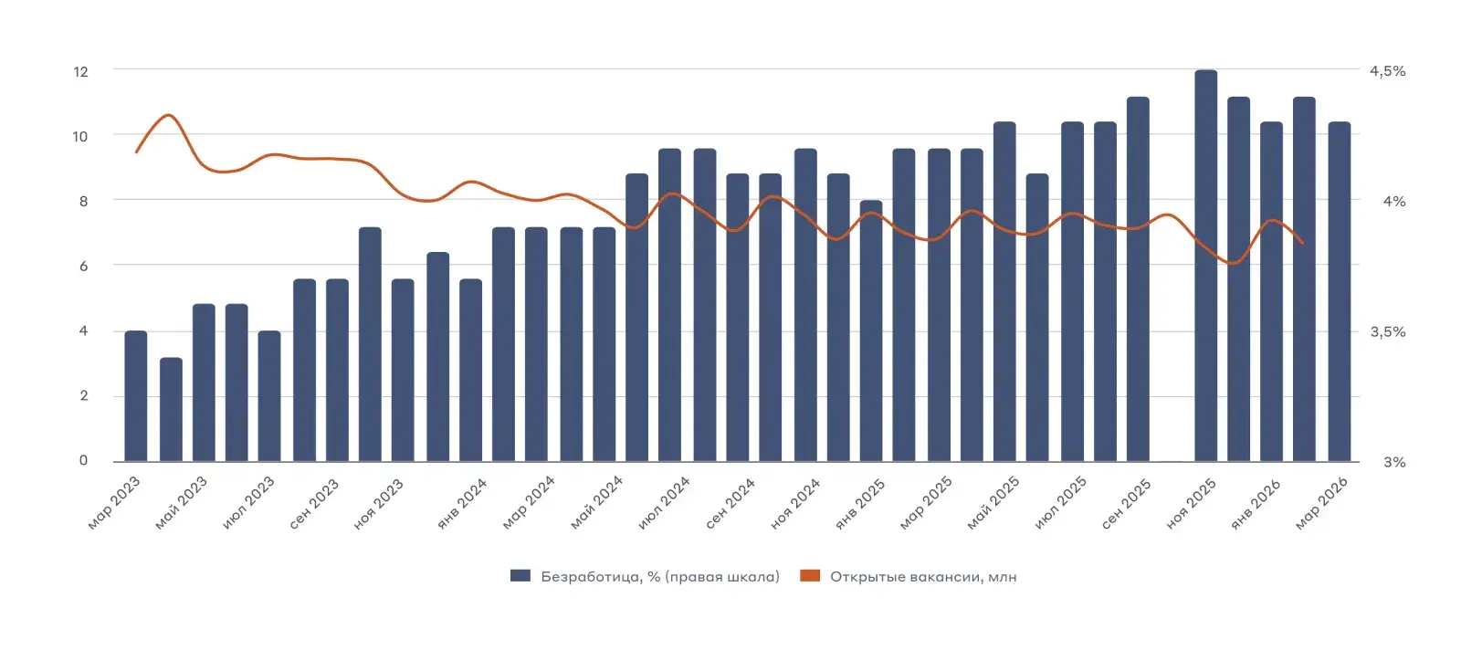 Это отражается на состоянии экономики. Уровень занятости снижается с начала 2025 года. Одновременно сокращается количество открытых вакансий — показатель вернулся к уровням 2020 года. Уровень безработицы находится вблизи максимумов за последние пять лет.