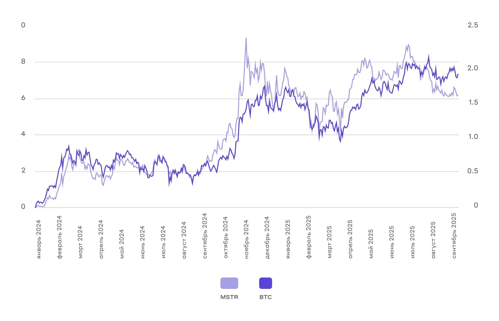 Коэффициент корреляции между акциями Strategy и биткоином достигает 95%, что указывает на очень высокую зависимость динамики бумаг компании от движения криптовалюты. При этом, коэффициент бета составляет 1,62: это означает, что при увеличении курса биткоина на 1% акции Strategy в среднем растут на 1,62%.