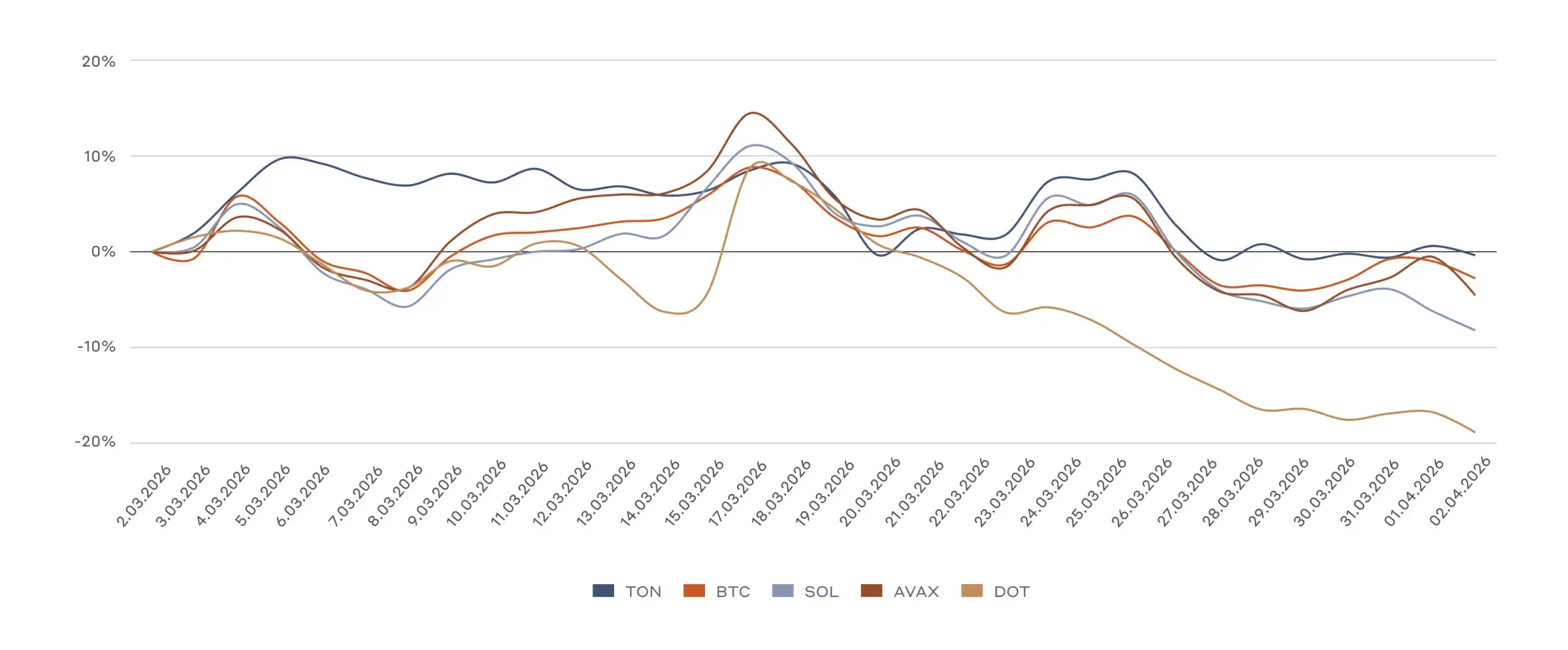 Вместе с рынком снизились и крупные альткоины — более чем на 30%. Toncoin на этом фоне показывает более сдержанную динамику, близкую к динамике биткоина. Это связано с более устойчивыми фундаментальными характеристиками.