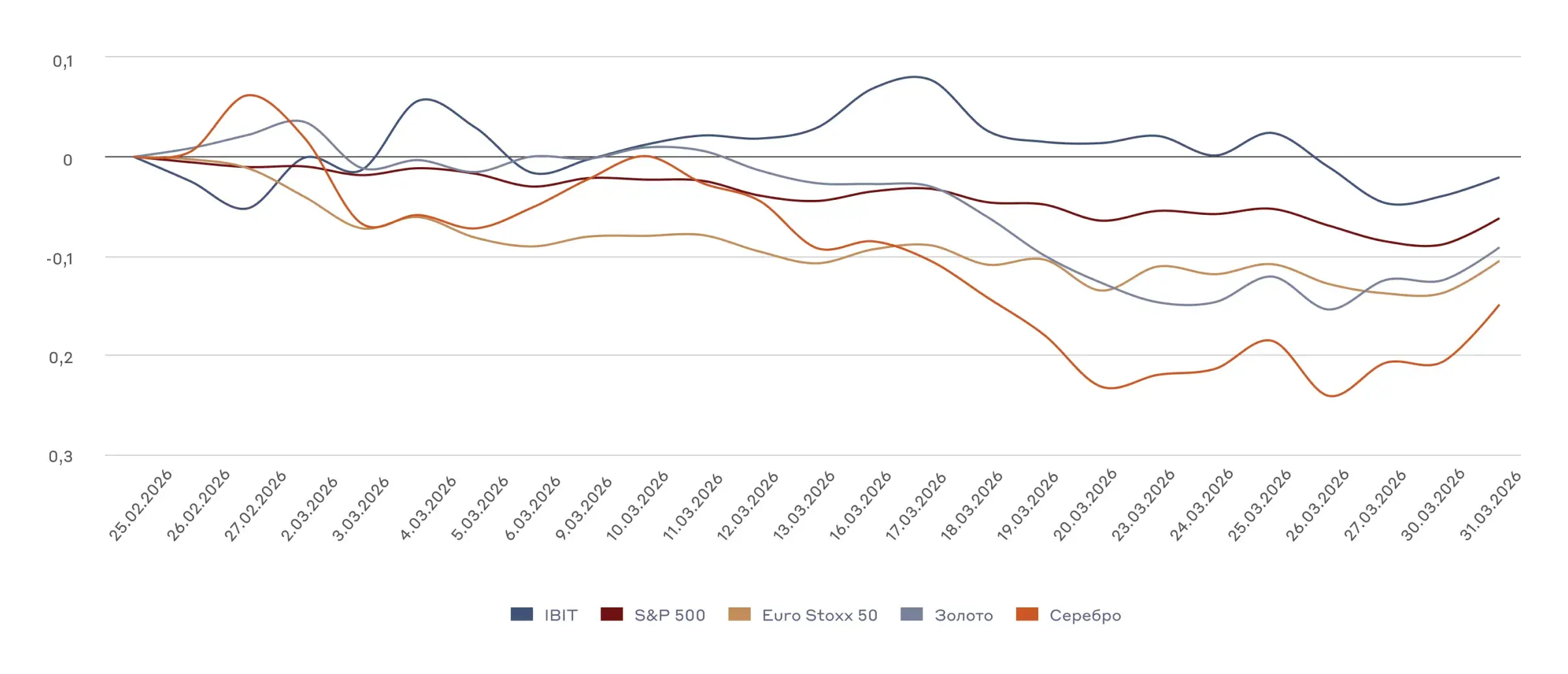 На фоне эскалации конфликта на Ближнем Востоке криптовалюты снижаются слабее, чем фондовые индексы и защитные активы. Золото с конца февраля снизилось почти на 9%, серебро — на 15%. В то же время цена биткоина снизилась всего на 2%.