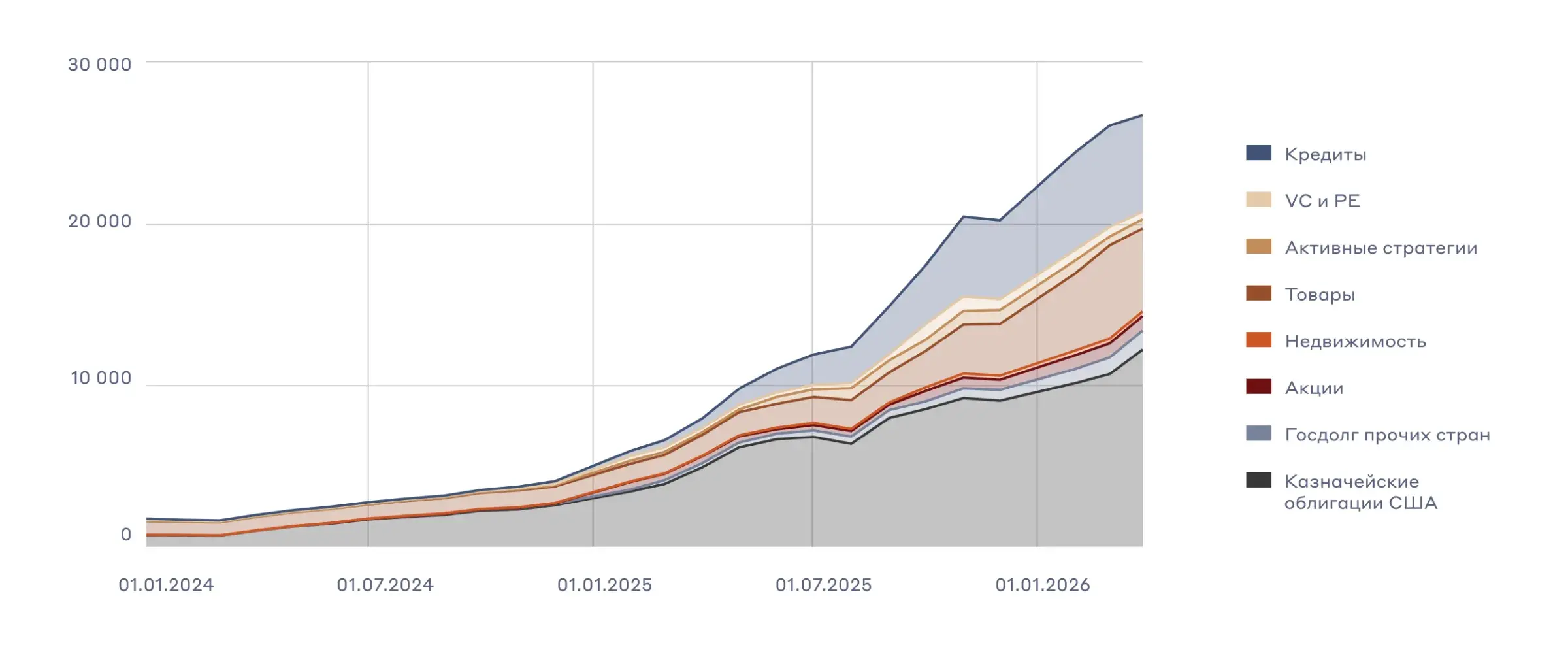 Около 46% рынка RWA приходится на токенизацию казначейских облигаций США, ещё 22% — на различные виды кредитов. Сегмент токенизации недвижимости оценивается почти в $300 млн.